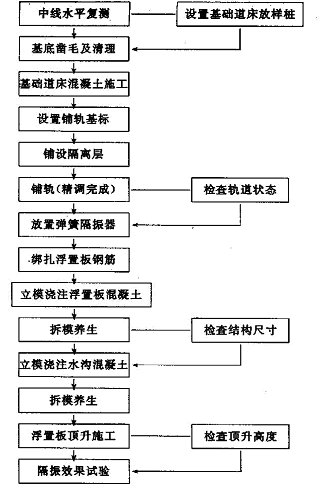 针对列车运行震动对沿线建筑物等有影响的城市轨道而言, 采用弹簧阻尼系统浮置板式道床, 深圳地铁的结构型式与施工方法在国内尚属首次。文中所述的浮置板施工方法, 同类似的其它工艺相比较, 具有施工简便、工程成本投入较少的优点, 建图3 浮置板施工工艺流程图议读者根据工程特点灵活运用。
