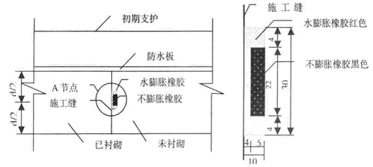 在两次浇筑混凝土之间设施工缝,灌注前应对施工缝进行处理,首先清除表面的水泥浆薄膜、松动石子或软弱混凝土,然后在二衬中部设置遇水膨胀橡胶条。施工缝的基面必须进行凿毛,使两次混凝土浇注接触良好,减小可能出现的裂缝。见图1 所示。