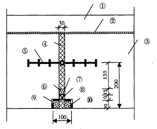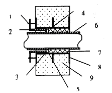 1 、螺栓;2 、压紧法兰;3 、胶圈;4 、止水环; 5 、挡圈;6 、主管;7 、嵌填料;8 、翼环;9 、主体结构期支护之间会形成较大的空隙。如果防水板有漏洞,地下水会渗入二次衬砌内,混凝土本身不密实,水会渗至二衬表面。通过在隧道背后进行填充压浆不仅可以填充由于混凝土浇注不饱满形成的剩余空间,使初期支护和二次衬砌密贴而共同受力,而且可以填塞由于混凝土不密实或开裂而形成的缝隙,封堵地下水的流径而起到防水的作用。在隧道背后填充压浆可以避免在混凝土内表面处理时形成的外观缺陷。压浆管在拱部混凝土浇筑之前预埋在拱顶处。压浆管采用42 无缝钢管,上端距初期支护下的防水板2cm , 下端穿过模板10cm 。钢管为直线形,不需在管上钻孔,在每衬砌循环的隧道拱部中间设置和可能出现渗水处设置。当混凝土强度达70 % 后并形成完全封闭圈后即可进行。