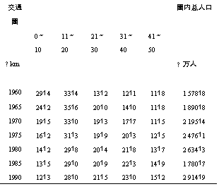 对更多产业有凝聚力, 对中小城镇和乡村具有较大吸引力。在城市化前期, 大城市发展较快, 城市数量和城市规模都在增加, 我国现阶段城市化就处在这个阶段。但大城市又因产业和人口过分集中, 在住房、交通、土地利用和污染等方面带来一系列社会问题。因此, 在城市发展至一定程度, 会出现城市向周围地区的扩散现象。本世纪60 年代, 工业发达国家城市化进入较高阶段, 随着郊区职能进一步完善, 出现郊区城市化, 城市中心衰退和停滞现象, 城市中心区人口呈下降趋势。出现这种现象的主要原因是经济发展的结果, 经济发展同时促进了交通技术发展, 出现了大容量快速运输系统, 使得职工在1h、50 km 的半径内从事业务、通勤通学成为可能。表2 为日本东京50 km 半径交通圈人口分布变化, 表3 为日本三大交通圈通勤通学所需平均时间。