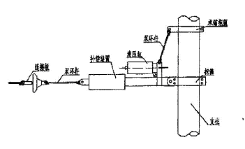整体链形结构的一个突出特点是取消了以往使用坠砣的滑轮补偿装置,取而代之的是一种新的补偿装置进行张力调整。新补偿装置的工作原理是:由于外部温度的变化使得链形结构发生扩张和收缩;链形结构的伸长和收缩控制高压氮气并通过液压缸活塞传递来调整线路上的张力。补偿装置的张力能达到40 kN 。气压补偿装置见图2。