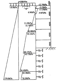 水压力的加载为Pw = Cwz + Dw, Cw = -10. 0 , Dw = -10. 0 基坑的支撑布置与土压力加载简图见图1 。