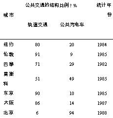 世界部分大城市公共交通的结构比例列于表1。从表中可以清楚地看出我国在轨道交通方面与世界先进国家的差距。相比之下, 新加坡、韩国、印度等国轨道交通起步尽管没有我国早, 但发展速度却比我国快。以地铁为例, 我国现有地铁线总长101.3 km; 而韩国汉城1974 年才开始修建地铁, 现已建成7 条干线, 长度达216.5 km, 且计划于2005 年建成总长度120 km 的第三期工程。