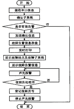 集中监控系统对通信各子系统的运行情况进行24 h 不间断故障信息收集, 当传输、公务、无线、调度、轨旁、广播、时钟、电视、电源各子系统的维护监控终端向集中告警终端发送故障告警信息时, 首先判断该告警信息是否为有效的, 若有效, 则集中告警终端发出声光告警信号, 通知中心维护管理人员, 否则给告警子系统反馈一个告警无效信息。集中告警终端记录收到的故障信息并存入数据库, 以对各类发生的故障进行统计、分析和打印。系统软件流程主框图如图2 所示。