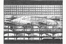 构形成了一个整体。该设计旨在反映钢、光滑的月台玻璃走廊和建筑立面板层的网状结构的微妙结合。玻璃顶表现为边长为112 m 的正方形栅格群,每个栅格单元都有斜交索缆支撑。通过使用弓形、柱形和斜交索缆的混合结构,就形成了一个贝壳形结构系统,间距20~30 m 的支撑框架为其提供了必要的支撑,所有这些都溶入了预应力索缆横梁中。