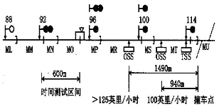 为了使信号机100 的显示可以从红色灯光转为单黄灯, 轨道电路MO 段被设置成时间测试区间, 其长度由列车速度从125 英里/ 小时减到100 英里/ 小时所需用的时间来确定。列车在到达信号机96 的轨道信号点前, 信号机96 显示黄灯, 当列车经过轨道信号点后(列车从MO 进入MP 区段), 信号机96 将显示双黄灯, 信号机100 将显示黄色灯光, 此后列车将从100 英里/ 小时继续制动。因为100 英里/ 小时的速度对交叉点来说是个危险的速会防护任何列车的过速, 如图3所示。