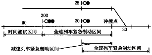 护系统。伦敦地铁没有固定长度的列车制动间隔区间, 每趟列车的停车进路都是单独计算的。进路长度的确定标准是要保证每趟列车通过红色(禁止) 信号图1 伦敦地铁车站速度控制实例图灯时, 列车停车装置会对列车实行制动, 从而使得制动区间, 测出这个距离可得到与之相等的列车运列车在到达可能的撞车点(例如道岔交叉点或停在行速度(例如100 英里/ 小时) 。信号机前方的列车) 之前停下来。此外, 对列车速同时, 在速度控制信号机的前面要设置一个时度的估算也不能只用线性速度, 而要获得列车在到间测试区间, 通常由轨道电路构成。轨道电路具有达禁止信号之前的最大速度。因此, 列车制动间隔可以确定列车位置的功能(例如电子计轴器) 。区间应该比标准的183m 轨道电路要长些。当进路上的列车已经在预定的时间占据了时间鉴于上述原因, 许多列车停车进路采取对相关测试区间, 速度控制信号灯就会由红灯转成黄灯道岔实行锁闭的方法, 来防止其他进路对该进路构(例如信号机300 由红灯改点黄灯), 这就确保了列成的不安全影响。如图1 所示, 信号机30 的接车车已将速度降低到足够的水平。列车在这种速度下进路将对33 号道岔实行锁闭, 由此防止办理信号运行, 即使再重新加速, 下个信号机(例如信号机机28 发车进路的可能。这种方式将极大地防碍车30) 防护的区段也能保证列车在到达撞车点之前安站的行车作业和效率, 即在接车的时候相邻的股道全地停下来。