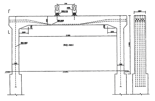 当轻轨线路跨越较宽的城市道路又不能在道路中间设置桥墩时,可设置门式刚架墩。刚架跨度在15 m 以下时可采用钢筋混凝土结构,刚架跨度大于15 m 时可采用预应力钢筋混凝土结构。见图6。