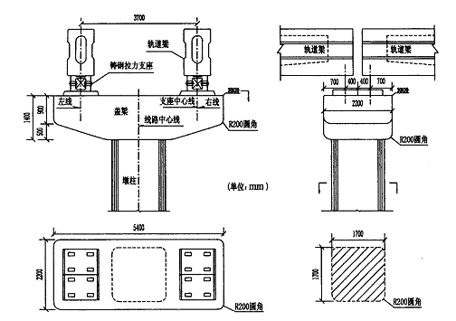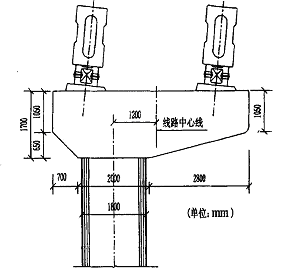 (1) T 形独柱墩 这是重庆轻轨工程中应用最多的墩柱形式。应根据结构分析计算结果和各项控制标准确定墩柱截面尺寸,同时根据上部轨道梁支座的构造尺寸及预埋件构造要求确定盖梁的构造尺寸。一般墩高小于1. 5 m 位于半径大于等于1 000 m 曲线及直线上的桥墩采用1. 6 m ×1. 6 m 方形截面,位于半径小于1 000 m 曲线的桥墩采用1. 7 m ×1. 7 m 方形截面,墩高15~25 m 时采用1. 8 m ×1. 8 m~2. 2 m ×2. 2 m 方形截面,盖梁高度均采用1. 4 m。见图3。