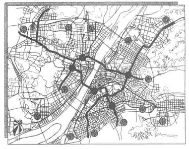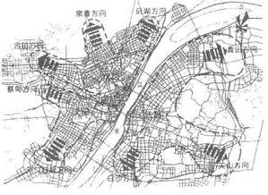 武汉市城市总体规划延续了长江两岸三镇鼎立、均衡发展的城市格局。受湖泊、山体的自然阻隔,汉口、汉阳、武昌三镇形成了比较明确的城市发展主方向。见图2 。