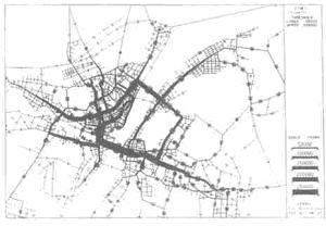 未来客流主要流向的分析主要是在客流预测的基础上进行的。运用加拿大交通规划专业软件, 根据1998~1999 年城市综合交通调查资料,建立武汉市客流交通预测模型。通过客流预测分析,掌握未来城市公交客流需求和空间分布形态(见图3) 。通过客流主要流向的研究,确定了轨道交通的走廊。