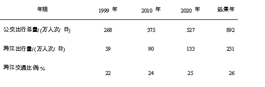 通过研究,得出2010 年、2020 年和远景年公交跨江总量见表1 。
