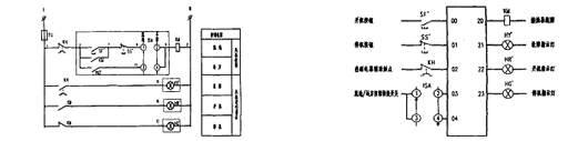 图2 中,就地控制可以通过操作就地控制箱面板上的启停按钮SS′、SF′实现。当实现远方控制时,PLC 输出点使YKZ 接通,风机启动; 当YKZ 断开时,风机停止运行。风机的两级控制由设置在就地控制箱的转换开关1SA 切换实现。风机的启、停、故障状态,以及风机的控制方式,由PLC 通信模块经网络送至车站控制室的车站级控制系统显示,同时也在就地控制箱面板上显示。用PLC 实现风机控制输入、输出的接线图如图3 。从图2 、3 可以看出:风机控制原理图使用元器件少、接线简单。风机就地控制箱内主要安装启停按钮、状态指示灯、转换开关,PLC 安装在就地控制箱内或者独立安装。从就地控制箱至配电室只需就地控制。即由原来的三级控制改为两级控制。