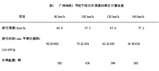 表1 广州地铁3 号线不同行车速度时牵引计算结果