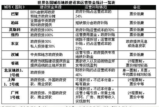 参考资料:城市轨道交通研究2001-2/3《世界八大城市的轨道运输》同济大学主办国内外地铁投资管理体制比较分析