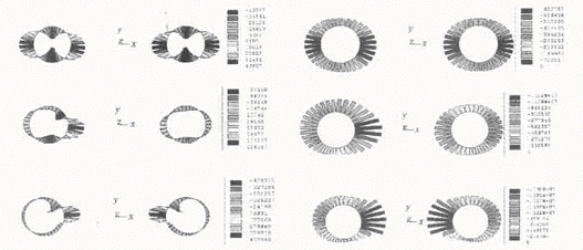 注释:左侧为弯矩图(单位:N·m) ,右侧为轴力图(单位:N) ,从上到下分别为步骤1 、步骤2 和步骤6 图4 盾构隧道弯矩和轴力图