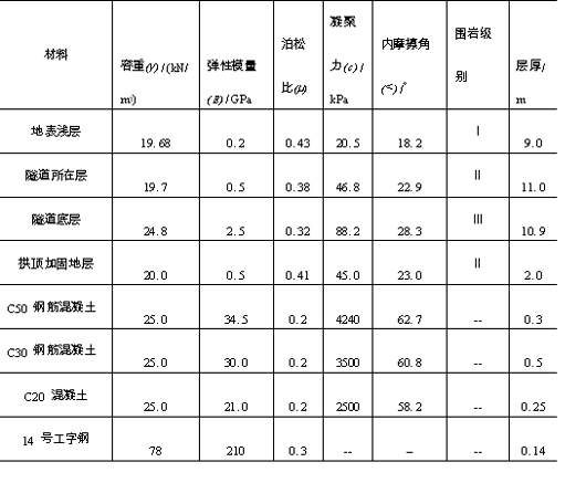 地质情况综合合并简化为3 层材料性质的岩土体进行计算分析,即地表浅层(合并了人工填土、冲积粘土层和稍密残积土层) 、隧道所在层(中密残积土层) 和隧道底层(岩石各种风化带),其合并后地层参数为各合并层参数按层厚的加权平均值。盾构隧道管片衬砌采用C50 钢筋混凝土,考虑到接头对管片结构整体抗弯刚度的影响,取刚度折减系数为0. 8 、弯矩增大率系数为0. 3[4 ] 。主体结构为C30 钢筋混凝土,临时支护钢支撑用14 号工字钢(A3 钢,惯性距712 ×10-8m4,面积21. 5 ×10-4m2,截面高14 cm) 、每米一榀;喷混凝土用C20 混凝土,厚度为25 cm ; 最后修筑的二次衬砌为C30 钢筋混凝土。拱顶地层加固范围为2. 0m , 加固区岩体和超前支护采用将围岩参数提高的等效方法进行模拟。所有材料物理力学参数列于表1 中。