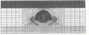 为了考察该车站主体结构、普通盾构管片和临时支护在施工过程中的可行性与安全性以及围岩的稳定性,采用二维有限元对车站修建整个过程进行了数值模拟分析。采用平面应变有限元法、围岩本构选用Drucker -Prager (D -P) 准则、支护衬砌用弹性本构、用单元的“ 生(alive) ”与“ 死(kill) ”的性质和等效释放载荷的概念来模拟隧道的开挖[3 ] 。使用等参四边形单元(plane42) 模拟围岩,梁单元(beam3) 模拟主体结构、普通盾构管片衬砌和临时支护结构。计算边界为:左右边界为1. 5 倍三连拱隧道跨度,下边界为1 倍三连拱洞室高。整个模型高33. 12 m , 宽80 m , 轨面埋深为20. 0 m 。为了获得较为可靠的分析结果,本次采用大型通用有限元软件ANSYS 程序进行了数值分析,其有限元网格划分如图2 所示。