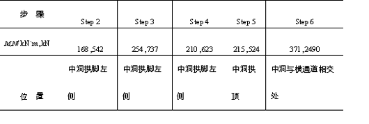 3. 2 车站主体结构的力学分析岩的扰动,从而减小所产生的附加弯矩。联络通道的中洞结构最大弯矩和相应轴力随开挖过程的变化见表3 , 中洞的部分弯矩图和轴力图见图5 。由计挖右侧拱底部分时,其弯矩又增大了,这是因为跨度算结果可知:随着中洞的开挖,衬砌上的内力随着地达到了最大;在修建联络通道时,中洞左侧与联络通应力重分布而变换,特别在实施步骤3 时,中洞拱脚道交接处的弯矩最大值为371 kN·m , 轴力最大值左侧弯矩达254 kN ·m , 因处于偏压下,故弯矩较为2 490 kN , 这是因中洞结构两侧的土体被移去和大;然后实施步骤4 时,拱顶和拱脚的弯矩值在数值联络通道与管片结构的刚接,使得连接处弯矩和轴上都有所下降,这是由于偏压减小而导致的;但在开力都急剧增大,这对结构的受力是极为不利的。