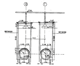 托换桩设在隧道两侧距隧道开挖线50cm 以外,每侧各设3 根?300mm 钢管灌注桩,下钢管?219mm , 桩端低于隧道底5m , 且入中风化岩1m , 设计单桩承载力692kN 。钢筋砼托梁位于地面下原扩大基础上,托梁与桥墩柱固定连接,形成刚性支撑。托换梁与隧道中线垂直布置,为8m ×2. 9m ×1. 0m 的C30 双肢钢筋混凝土框架结构,单肢截面为500mm × 1000mm , 托梁中部与桥墩墩柱锚结,钢管桩与托梁在预压封桩后,用同级砼填充桩梁间预留间隙,连接成整体。托换及加固结构示意见图1 。