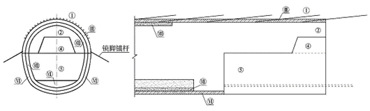 (2) 下台阶开挖及支护下台阶采用人工配合机械开挖, 开挖机械选用Ⅰ —超前小导管施工; ②—上台阶环形开挖; ○注: ○Ⅲ 上台阶支护结构施工,格栅钢架、喷混凝土等; ④—核心土开挖; ⑤— 下台阶开挖; ○Ⅶ —仰拱及填充混凝土施工; ○