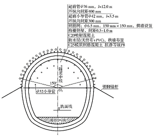 ①超前管棚 本工程在富水砂层地段采用<76 MPa 。mm 管棚超前支护。管棚采用XY-100 型液压钻机成②超前小导管 根据设计情况,小导管在少水段布置在拱部120°范围内;在富水地段,布置在拱部180° 范围内。小导管采用<32 mm 钢管,长3.5 m ,每两循环布置1 组,环向间距为30 cm。小导管采用凿岩机成孔,之后采用凿岩机推管入孔。小导管内注入水泥-水玻璃双液浆,水灰比为0.6~0.8 ,水玻璃玻美度为 ③格栅钢架 钢架分段在洞外加工,洞内拼装,为孔,然后用钻机将<76 mm 钢管顶入孔内。管棚采用防止拱脚下沉,在两侧各设1 根锁脚锚杆,锚杆长3.5 分节组装,每段长度为4~5.0 m ,采用丝扣联结。管m。钢架设置间距在围岩条件好时为1.0 m ,围岩条件棚长1210m ,布置在拱部150°范围内,环向间距为40 较差且地下水量大时为0.75 m。环向采用<22 mm 钢筋、间距50 cm 连接成整体。④ 喷混凝土 喷混凝土采用湿喷工艺,多次复喷至设计厚度。混凝土洞外拌制,经竖井串桶下到料车内运至施工点,喷射作业采用TK-961 湿喷机。