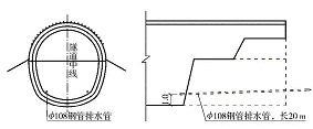 ① 超前排水 超前引排水在全部区间隧道内采用,排水效果明显,基本保证拱脚至隧道底部以上处于少水状态,改善了施工条件,保证围岩稳定,超前排水设计见图4 。钢管内排引的地下水由排水管道直接排入集水井排出。<108 mm 钢花管采用地质钻机钻孔并推管入孔,仰角为1°~3°,钢管分段组装,分段长度4~ 5 m , 丝扣连接,左右两侧各布置1 个,随着开挖的进行分段拆除。