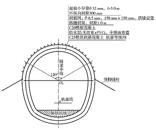 区间隧道初期支护采用喷锚构筑法施工,不同地质地段采用不同支护参数,少水地段支护设计参数见图2 ,富水地段支护参数设计见图3 。