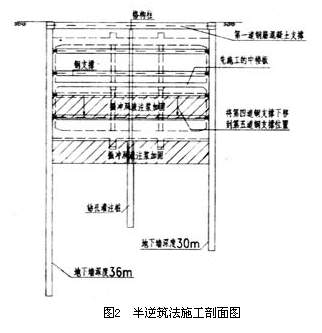 (2)由顾筑法改为半逆筑法施工,即在中楼板下设置支承中楼板的立柱桩,并利用原设计的楼梯孔作为暗挖出土孔。