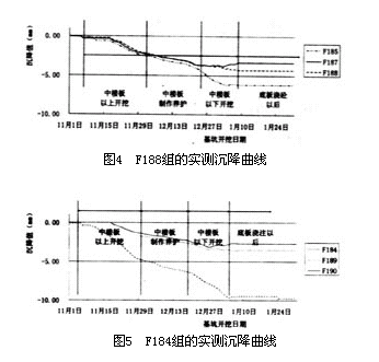以具有代表性的混7A楼房2组监测点(测点布置见图1)为例进行分析,混7A位于标8段,其中F184点是距离围护墙(0.4m)最近的监测点,F185点距离围护墙3.4m;F188点距离基坑最远(30.2m)。图4是基坑开挖过程中F188组的实测沉降曲线,图5是基坑开挖过程中F184组的实测沉降曲线。