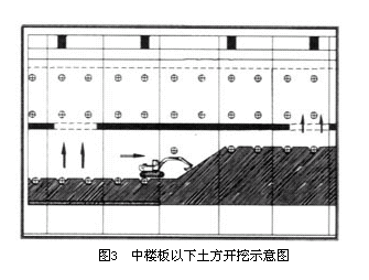 (7)由于逆筑法施工作业空间狭小,支撑安装后挖掘机往往无法作业。为不使开挖与支撑安装发生冲突,延误支撑安装,因此将中楼板构筑前已经支撑到位的第四道下落形成第五道支撑,从而保证作业高度,并且采用自出土孔向外侧退行挖掘,抽槽安装支撑后应回填土方的方法。这样铺设钢跑板后,挖掘机可以在中楼板下自由行走,保证了土方的水平运输。中楼板以下土方开挖见图3。
