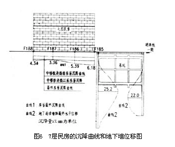 从图4、5中可以看到,基坑围护结构位移过程分为4个阶段:中楼板以上顾筑开挖(至第四道支撑)、中楼板制作养护、中楼板以下暗挖施工、底板浇筑及后期沉降。 F184一边墙体最大沉降为9.76mm,差异沉降为7.09mm,差异沉降率为0.25‰;F185一边墙体最大沉降为6.18mm,差异沉降为1.84mm,差异沉降率为0.07‰;房屋对角的差异沉降分别为5.42mm和3.46mm,有一定不均匀沉降。图6为7层民房的沉降曲线和地下墙位移图。
