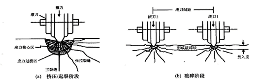 (1) 挤压阶段:滚刀在高推力作用下,切入岩石表面(切入深度1~10/15 mm , 取决于岩体强度), 同时岩面产生局部变形及很高的接触应力。并在此应力作用下,刀刃与岩石接触部分的岩体产生粉碎区,即应力核心区(pressure core) 。此核心区深度越深、范围越大对提高破岩效率越明显。