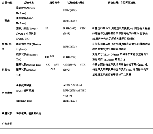 (2) 室内试验:国外室内试验是在总结多年工程实践基础上,经过不断修正、完善而成,内容远比国内齐全,也部分反映了其对破岩机理认识及刀具设计的思路(表2) 。