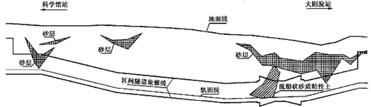穿越残积层和风化花岗岩。有三处含水丰富的砂层位于隧道上部, 部分侵入隧道断面, 层厚度2~10m 不等, 长度近700m , 占隧道全长达2/3 。有一处流塑状饱和粘土层侵入隧道断面内, 如图1 所示。