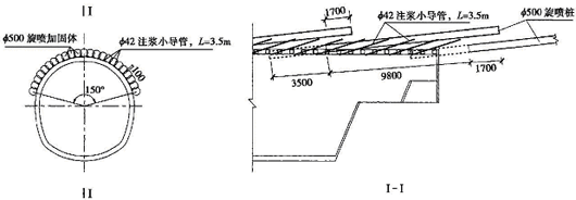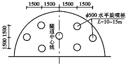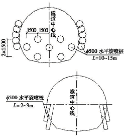 经在1# 竖井横通道中组织的几次试验效果综合分析比较, 确定采用第一方案。其主要特征是: 仰角为5°的洞内水平旋喷桩超前预加固形成拱棚。开挖掘进时, 用<42 小导管注浆补充加固和止漏。