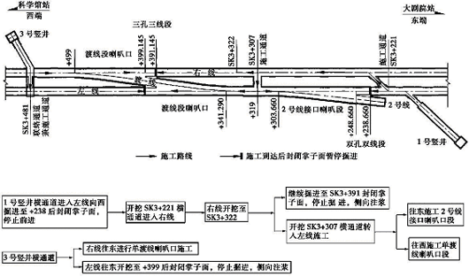 渡线段位于1 号、3 号竖井中间, 经过相关的理论分析和综合考虑各种施工因素, 最后确定如下施工路线(图12) :