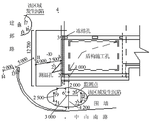 我国冻结法现已成为成熟的凿井施工技术,但在城市岩土工程中的应用还不多。冻结技术可在地面城市地下工程中的应用范围包括:盾构隧道盾构进墙、深层搅拌桩以及压密注浆对土体进行加固,在凿除洞门钢筋混凝土时发现洞门中心处东、西两侧有流砂涌入,迅速采用双液注浆堵水,过了两天又在有大量流砂涌入,对周围环境产生较大的影响,其中端头井东侧的沉降量增大,东部20 平方米 区域下陷1.5 m 左右(图1)。在这种情况下施工单位及时出洞土体加固、盾构隧道地下或海底对接时土体加采取措施,以保证施工以及周围环境的安全。固、城市地铁泵房、旁通道和急转弯部分、建筑基根据管线及房屋调查结果显示,在张府园车站坑加固、地下工程涌水、坍塌事故的抢险修复、地南端头井的东侧沿中山南路方向15 m 范围内有下隧道交叉处土体加固、桥墩基础施工等。南京地380 V 的电缆一根,直径约900 mm 的下水管一根,铁南北线一期工程TA7 标张府园车站端头井洞门南侧沿建邺路方向15 m 范围内有380 V 的电缆一补充加固时北京中煤矿山工程有限公司采用冻结法根,直径约1 200 mm 以及150 mm 的上水管一根。施工,取得了良好的施工效果。这些管线距加固区域距离均在8~15 m 范围之内。