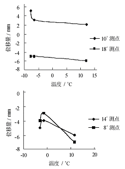 图4 观测点位移量与温度关系图