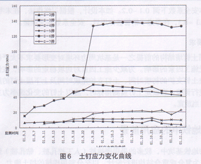 (2)土钉应力。从测试结果看,如图5(括号内为理论计算数值),土钉内力普遍较小,除G排土钉(中下部)受力较大,与理论计算近似外,其它具体数值与理论计算均无可比性。土钉应力一般在开挖下二排土钉(7d内)时变化较为剧烈(见土钉应力曲线),其后变化较为平缓。从监测结果看来,土钉直径采用+25足够了,设计时下部采用的φ28土钉偏大偏长。其应力变化如下图6。