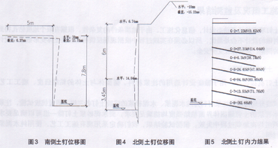(3)微型桩的计算分析。如上所述,设置了微型桩的土钉结构具有拉锚式支护结构的变形特征,从监测结果上看,土钉应力主要在施工下两排土钉时形成,与按“增量法”计算拉锚结构时的特征类似,但由于土钉与锚索在工作原理上不一样;土钉的端头也并未设置也不需要设置与钢管桩联接的传力体系(腰梁与锚具),两者之间的共同承载作用很弱,故不宜按拉锚结构来进行简化计算。《建筑基坑支护技术规程》,JGJ120-99中将钢管桩作为超前花管来进行计算,但如本设计中设置的微型桩,采用上述方法计算时对整体稳定性的帮助很小,笔者建议在此种情况下分析时不考虑微型桩的作用,而直接将选用的整体安全系数下调0.1~0.2。如本设计,根据习惯作法,在末考虑降水措施的情况下,其安全系数应上调0.1~0.3,在考虑了钢管桩作用后,安全系数未予调整。