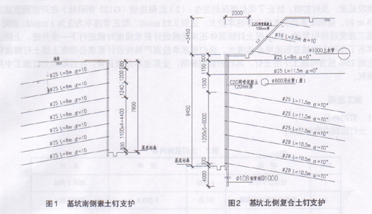 经过反复比选,未采用降水措施,土钉墙支护典型剖面如图1、2所示。土钉竖向间距在1.2m左右,水平间距为1~1.2m,土钉钻孔孔径110mm,溜注水泥砂浆全长粘接,注浆压力0.8MPa;土钉面层采用C20网喷混凝土,厚120mm;在北侧基坑没置了微型桩,桩位于面层背部,间距1m,采用ф108注浆钢管做成,钴孔孔径130mm,灌注水泥砂浆,注浆压力o.8MPa。采用泄水管浅层排除面层后渗水,泄水管长1m,每2~3m:设置一个。