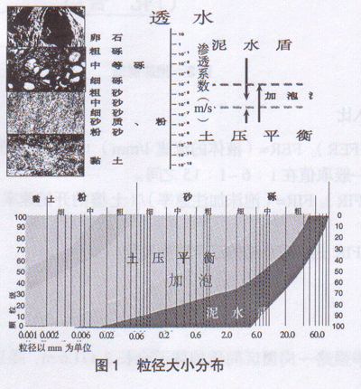 城市地铁隧道大都需要穿越不同的地层,在一条线路上可能会有部分不适宜土压平衡盾构机施工的地层,这就限制了土压平衡盾构的适应范围,但是如采用万能的泥水盾构则造价比较高,而且需要很大的场地来安置泥水处理循环系统。目前城市地铁施工可提供的场地越来越小,因此为扩大土压平衡盾构机的使用范围,使其能够适应各种不同地层的变化,可采取通过加注泡沫系统的办法来实现这目的,使土压平衡盾构机造价低、容易控制操作的优点得到充分发挥。加泡沫后改变土壤渗透系数、扩大土压平衡盾构机适用渗透系数土体及粒径的范围,见下图1。