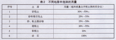 根据施工经验,我们总结出在不同地层中泡沫的用量,见表2。