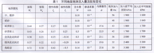 施工中我们对不同地层泡沫注人量和加注泡沫前后扭矩变化情况进行了统计,见下表1。