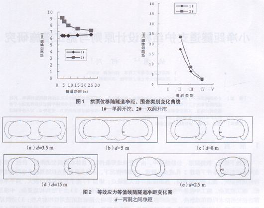 图1为开挖单洞和双洞后,拱顶位移与隧道净距、围岩类别的关系曲线图。可知拱顶位移随隧道净距减小、围岩类别降低而急剧增加。