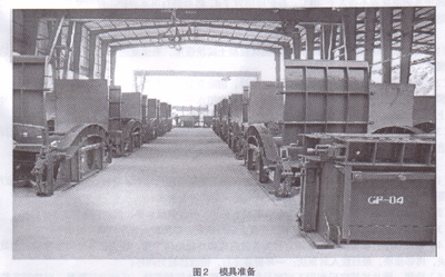 (5)钢筋笼骨架入模:钢筋笼在靠模上制作完毕,用龙门吊配合专用吊具按各种规格将钢筋笼放入模具内,钢筋笼型号与模具型号要匹配,保护垫块位置准确。模具准备见图2。