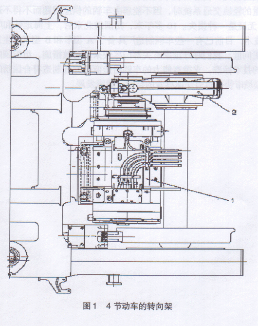 首先,让我们来了解一下联轴节和齿轮箱在地铁车辆转向架上的布置。目前上海地铁车辆为6节编组,头尾两节拖车不提供动力,提供列车动力的是中间的4节动车。这4节动车的转向架布置如图1(图为上海二号线动车半个转向架俯视图)。传动原理为电动机(1)得电,电机转动,带动联轴节转动,联轴节再带动齿轮箱(2)中的齿轮转动,齿轮带动轮对转动,从而完成动力传动。