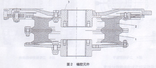 一号线联轴节是个橡胶元件(如图2所示)。它由3大部分组成,分别是两个橡胶元件(1)(2)和一个连接牵引电动机的法兰盘。其内部是空心的,两个橡胶元件分别由两个佣硷螺丝固定。定在牵引电机上,另一个固定在齿轮箱上。联轴节两端是通过花键连接在电机和齿轮箱上的。