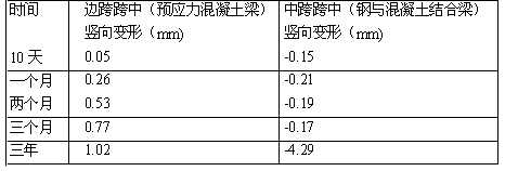 设计时对预应力束配置进行了优化,延长了加载龄期,经初步计算,架梁完成后各个阶段的徐变变形值如下表: